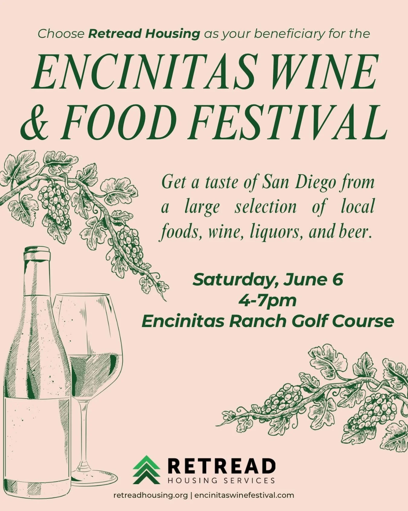 Choose Retread Housing as your beneficiary when you buy tickets to the Encinitas Wine & Food Festival on Saturday, June 6th.